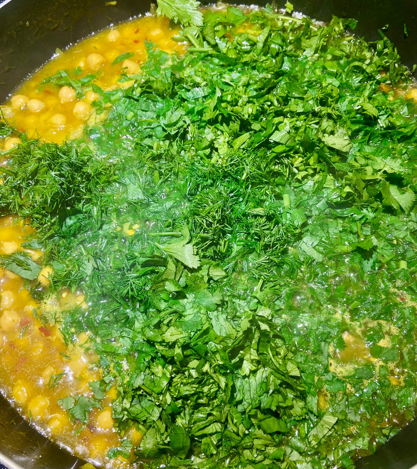 Add the herb mixture of baby spinach, parsley, cilantro, dill, chives and and cook until the spinach wilts, about a minute. Simmer for 5 more minutes then, add the lemon juice and some zest.