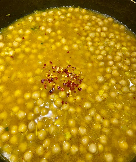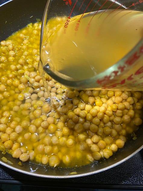 Add the chickpeas, saffron (if using) and broth - simmer for 10-15 minutes.