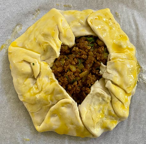 Place 1/2 the cooled beef mixture into the centre of the pastry. Fold over the edges of the pastry encasing the beef mixture. No need to be exact, you want a rustic look.