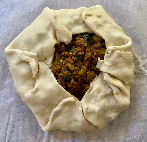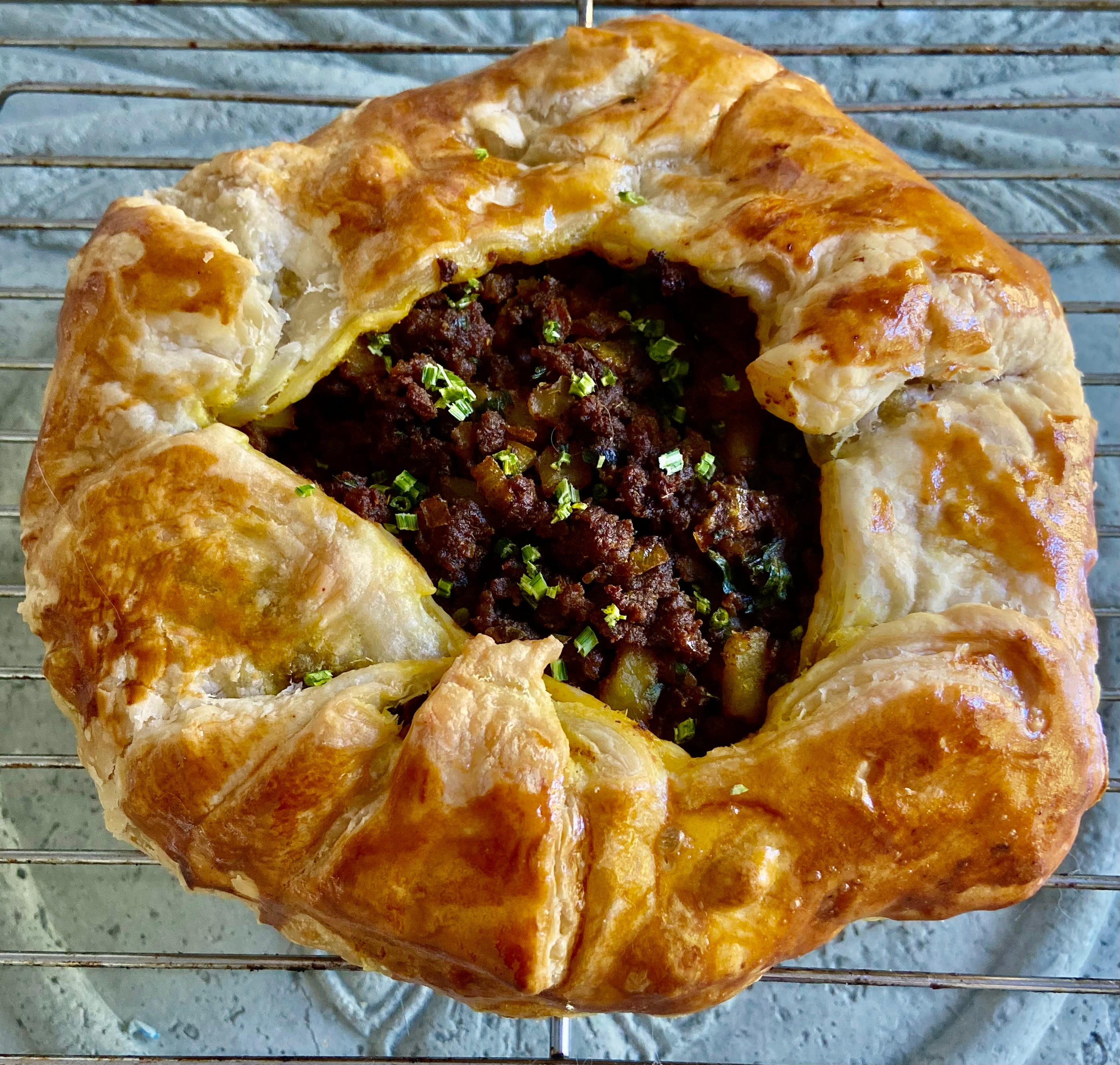 This is a very simple recipe of spiced up ground beef and boiled potatoes all enveloped in store bought puff pastry. I chose to encase the filling in a galette or crostata style puff pastry shell, I like the rustic look of a freeform pastry these days. Any pastry casing (puff pastry, short pastry or phyllo would be great too.) Some people encase filling in a in hand held semi circle pastry pocket, triangle shaped pastry, circular rolled shape, etc. The shape of your pastry crust is up to and completely subjective. I have included a few stock photos of different shapes of borek style pastries.