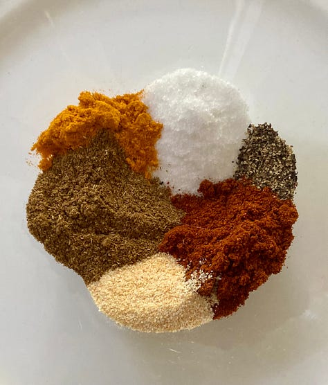 3. Add the spices, salt, pepper, turmeric, paprika and cumin. Sauté for another 2 minutes.