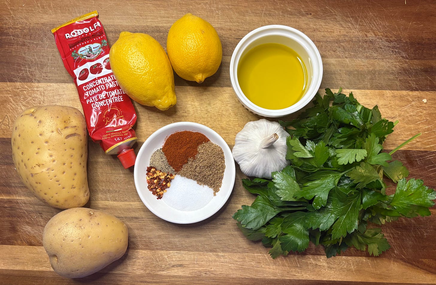 Next time you are making steaks, a roast chicken, fish, or even a simple salad try adding these to your table. The recipe is just a few pantry ingredients, potatoes, dried spices, tomato paste and cilantro and/or parsley - that’s it!