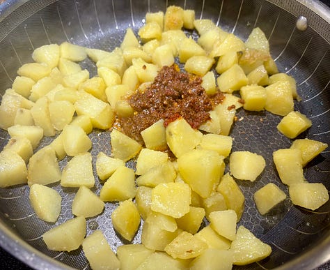 There are several methods to prepare these delicious spuds but, I will be showing you the easiest. The goal is to just have crispy potatoes, whether that be deep-fried, air-fried, or even roasted in the oven. Feel free to prepare the potatoes your favourite way to achieve that gorgeous crispness. I boil the potatoes then pan fry them until the outer layer gets crispy, and then toss them in the spicy “sauce”.